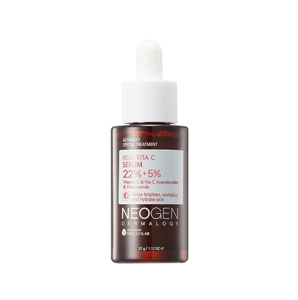Serum Neogen Dermalogy Real Vita C với Niacinamide và 22% Natri Ascorbyl Phosphate một nguồn vitamin C ổn định kết hợp cùng chiết xuất từ 8 loại trái cây và phức hợp vitamin E và B5. Tất cả đều phối hợp với nhau để làm sáng da, đều màu, làm mờ các đốm thâm mụn, sạm da, chống oxy hóa và ngăn ngừa lão hóa da. Sản phẩm an toàn, lành tính trên làn da nhạy cảm.